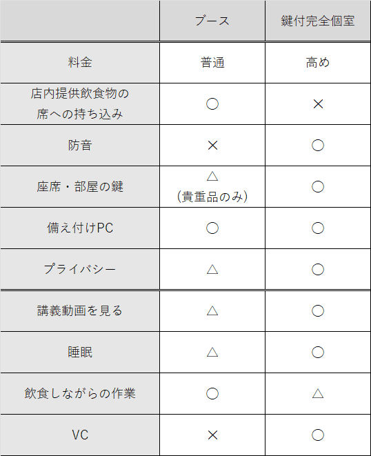 簡易的な比較表を作成したので、快活泊をする際の参考にしてください。その時その時の状況に合わせて使い分けると良いと思います。個人的にはブース席がちょうどよくて好きです。部屋の特徴についての比較は上の方に、実際にその座席で作業をする際の使い道の比較は下の方に書きました。